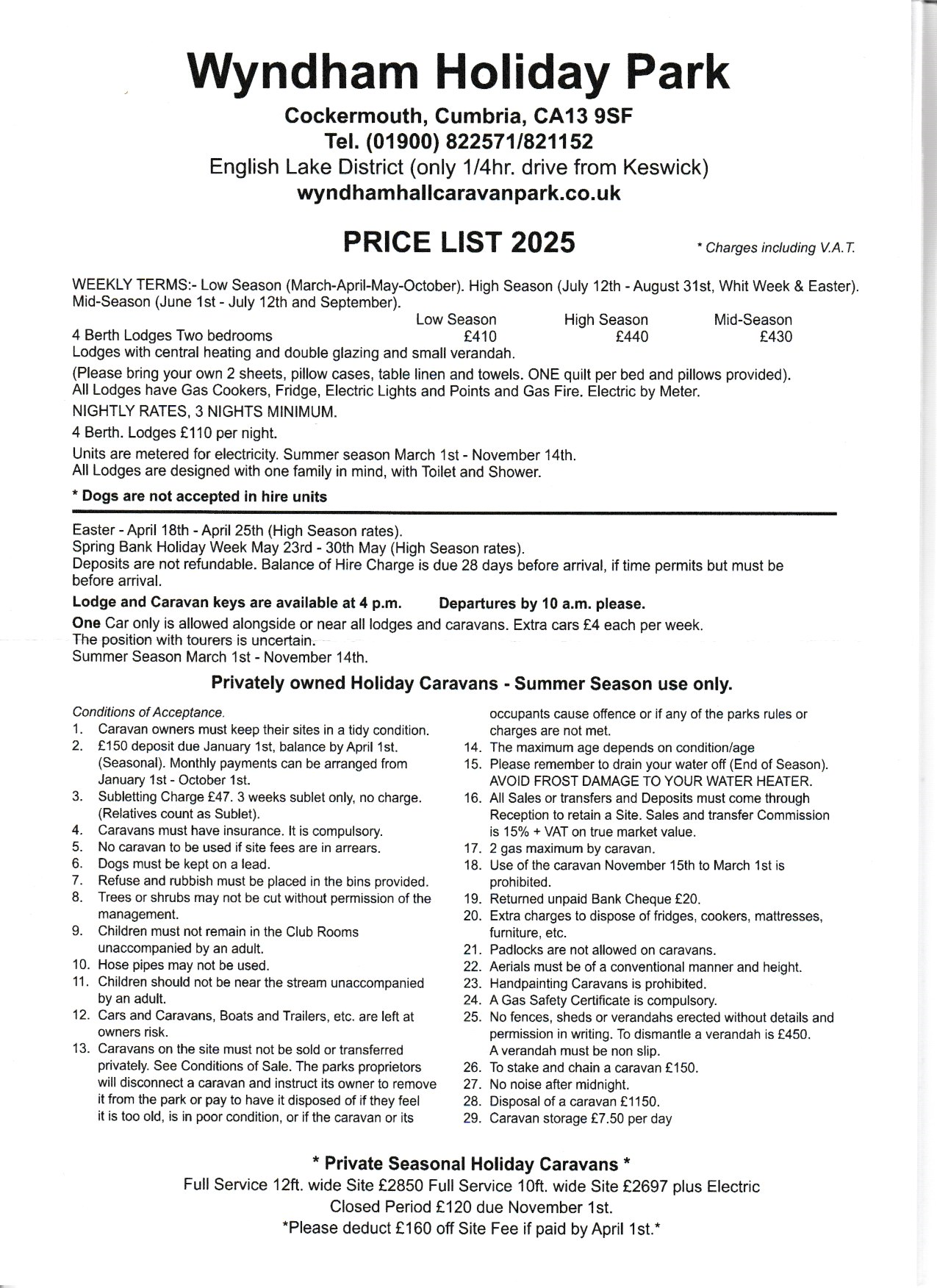 KEY DEPOSIT: In addition to the hire charges outlined in the brochure, there is a servicing and cleaning charge of £10.00 per caravan or lodge per booking. This is refunded on departure if the caravan or lodge is left in a clean and serviceable condition without shortages, breakages or damage, or by post if departing before 9:00am Saturday. Remember you will be the incoming tenants on your arrival and will expect to find your caravan or lodge in good order.